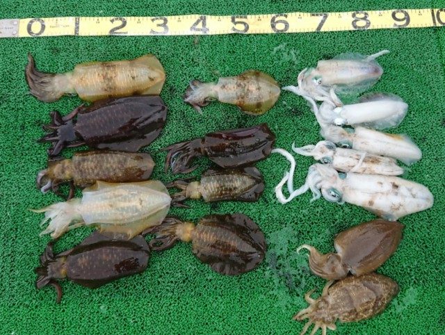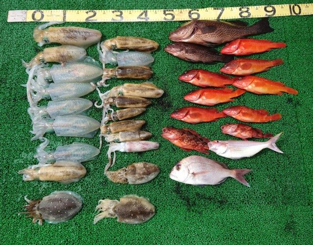 グループ中頭さんらと出航! 彼女さんビギナーズラックでイカ&鯛GET!小雨降る中最後まで頑張ってくれました!ぉ疲れ様でした! -