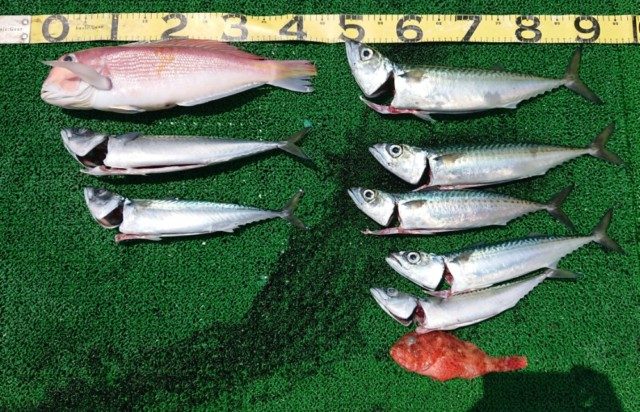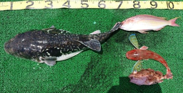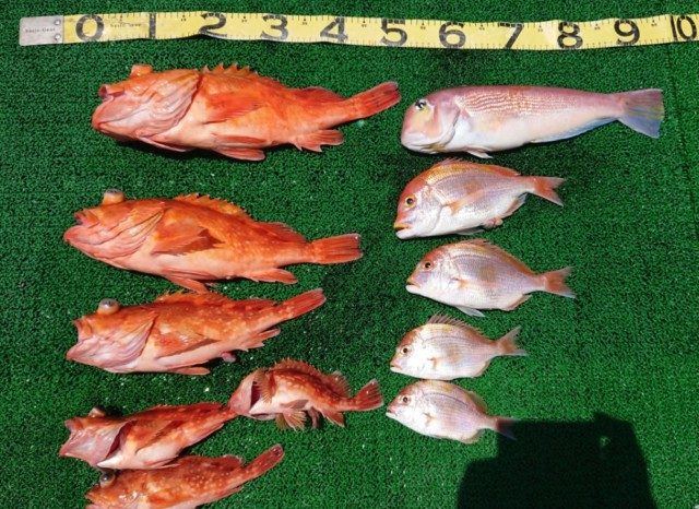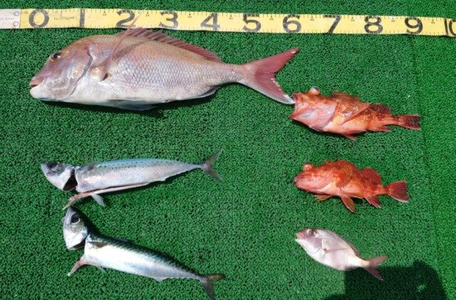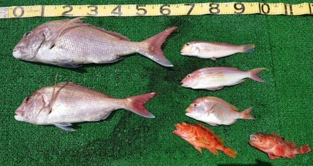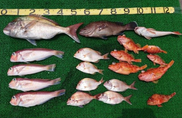 グループ長谷川さんらと出航!ウネリがあり湾内で五目釣りに!厳しい中最後まで頑張ってくれました!ぉ疲れ様でした! -