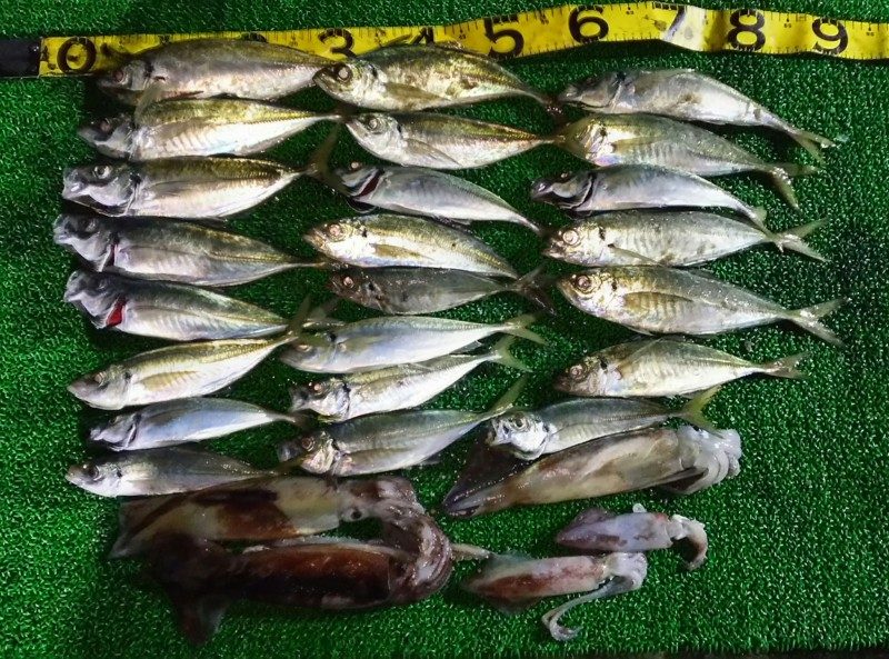三重の池ソンさんと悠チャル調査隊長と出航!水温が高くイカゎポツポツでしたがアジの方ゎプチラッシュもありまずまずの結果になりました!皆さん寒い中最後まで頑張ってくれました!ぉ疲れ様でした! -
